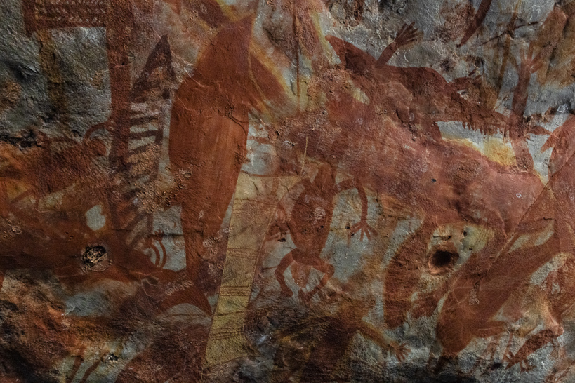 Sur une paroi de la grotte Wurruwarrkbadenumanja, à Groote Eylandt, ont été peints à l'ocre rouge des dugongs, des dauphins et des goannas qui incarnent autant de totems et d'ancêtres. Pour les Anindilyakwa, ces figures expriment la loi ancestrale vivante. Cet art rupestre date d'au moins 5000 ans, point d'ancrage d'une mémoire toujours active dans la culture aborigène contemporaine.