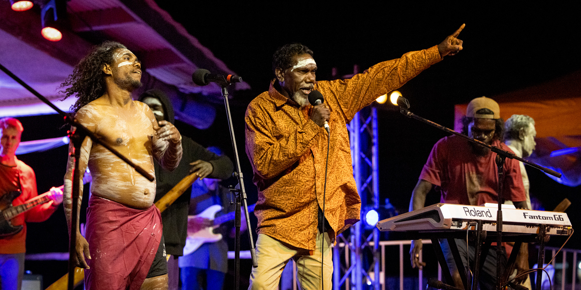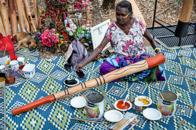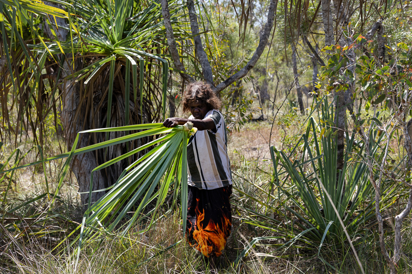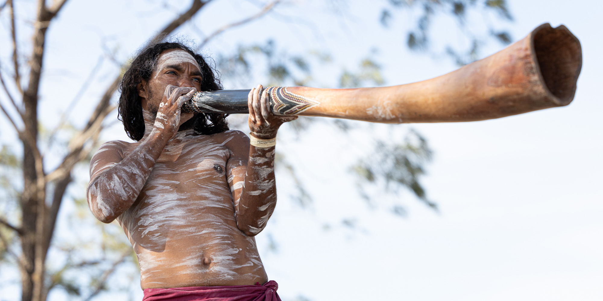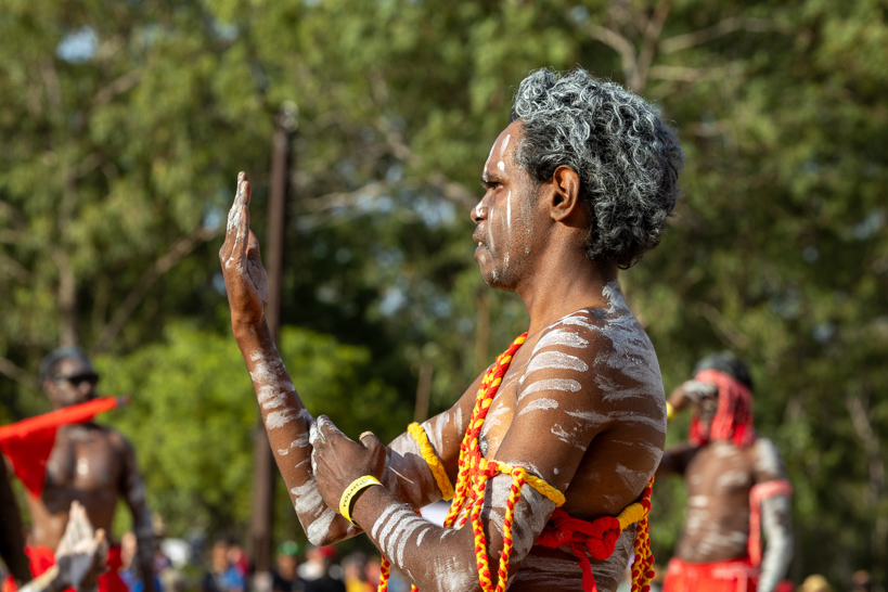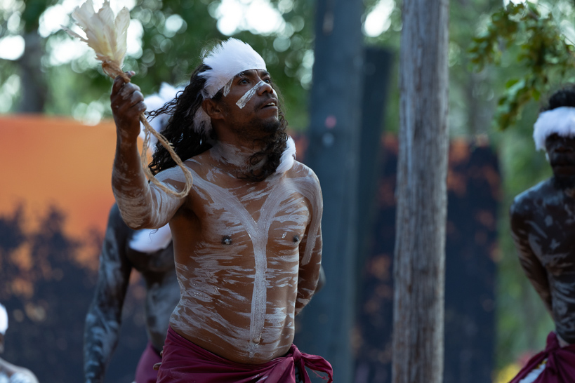 Les danseurs Red Flag de Numbulwar portent dans leurs bungguls la mémoire des premiers contacts maritimes avec les Macassans venus d'Indonésie. Leurs drapeaux rouges (jamajama) évoquent ces échanges anciens, inscrivant dans la danse une histoire de rencontres et de continuité culturelle.