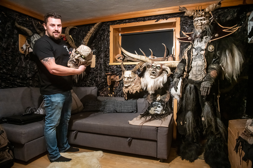 | Axams, Tyrol, Autriche. Jonas Gutheinz fait visiter une pièce du domicile familial où il entrepose son costume de Krampus et les différents masques qu'il possède. Il y a une dizaine d'années, il a remplacé son costume en peau de bête pour un personnage plus sophistiqué inspiré des films d'horreur et de la musique metal qu'il affectionne.