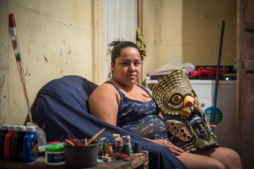 Roseybi Barios Taleno, 26 ans, assise dans son salon au milieu des peintures et pigments de couleurs servant à la décoration des masques. Dans ces mains, un masque à l'effigie d'un hibou sacrée, réalisée par son mari quelques jours plus tôt. Roseybi a la charge des motifs colorés et de la finition des masques selon les traditions des Borucas Cette activité complémentaire à l'agriculture leur assure un complément de revenu. Comme son frère Gabriel, Roseybi est d'origine espagnole et de confession chrétienne. Elle vit en union libre avec son mari d'origine autochtone et partage l'identité des Borucas, qu'elle perçoit cependant comme un folklore.