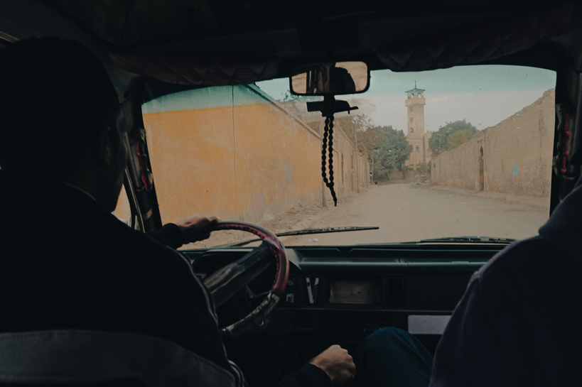 Al-Ghafeer, Le Caire, Égypte. À bord d'un taxi, Khalifa et son ami Mustafa traversent un cimetière où chaque tombe est protégée par de grands murs, certaines avec des maisons à l'intérieur.