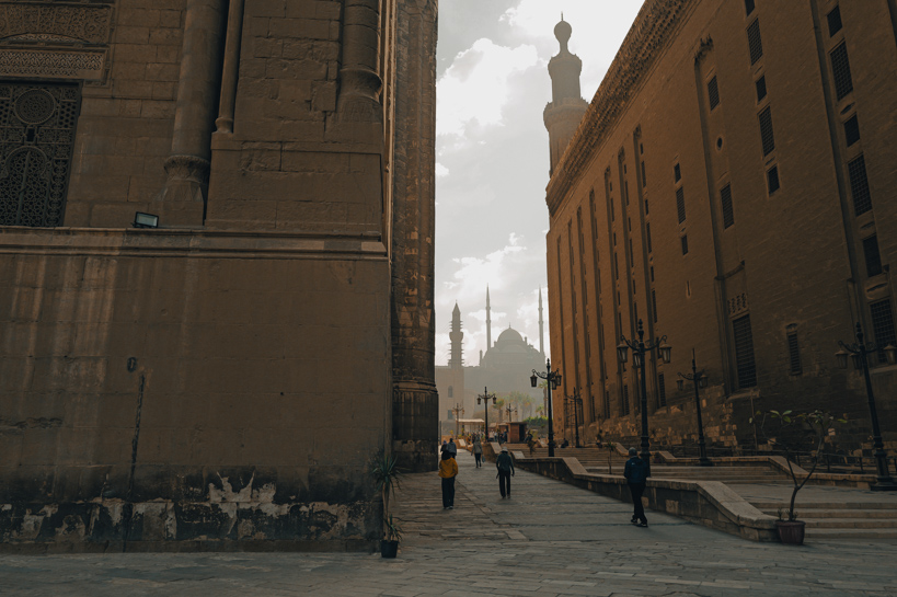 Al-Hattaba, Le Caire, Égypte. La mosquée du Sultan Hassan domine la capitale par son architecture mamelouke du XIVe siècle. Érigée face à la citadelle de Saladin, elle jouxte la Cité des morts, vaste nécropole habitée depuis des siècles. Ce voisinage illustre le lien étroit entre culte islamique, mémoire funéraire et vie quotidienne.