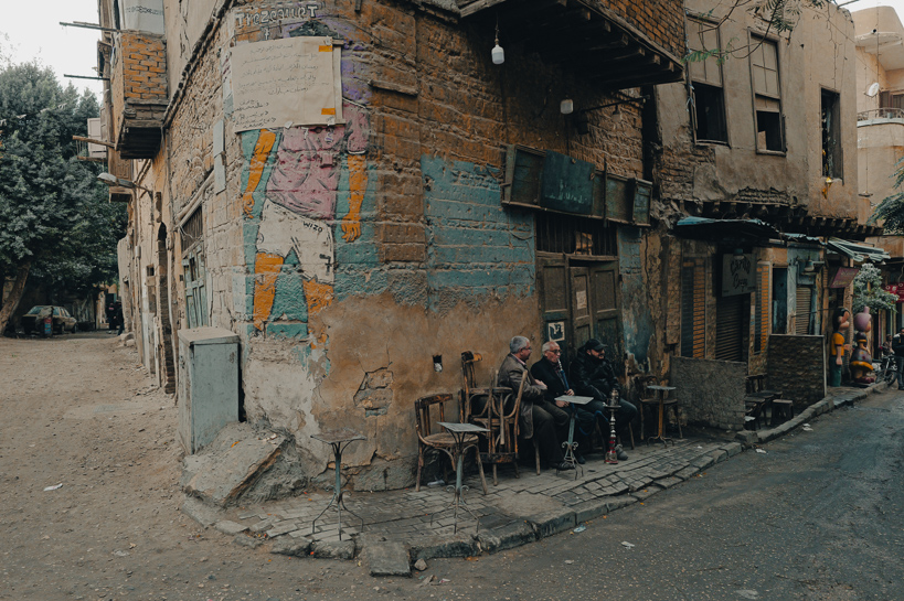 Al-Hattaba, Le Caire, Égypte. Trois hommes fument la chicha dans une rue commerçante. Au mur, une fresque de Mahmoud Trézéguet, footballeur international égyptien, a été recouverte, à l'occasion du ramadan, par la bénédiction du quartier par un édile.