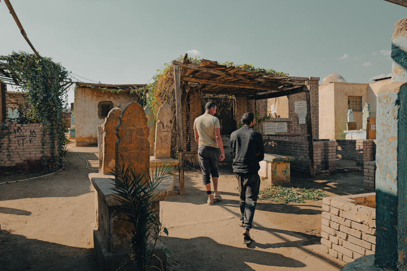 Al-Hattaba, Le Caire, Égypte. Adil et Ali, tous deux gardiens du cimetière, passent en revue les tombes pour s'assurer qu'elles sont bien entretenues. Chaque jour, ils parcourent ainsi les allées et veillent au bon fonctionnement du site.
