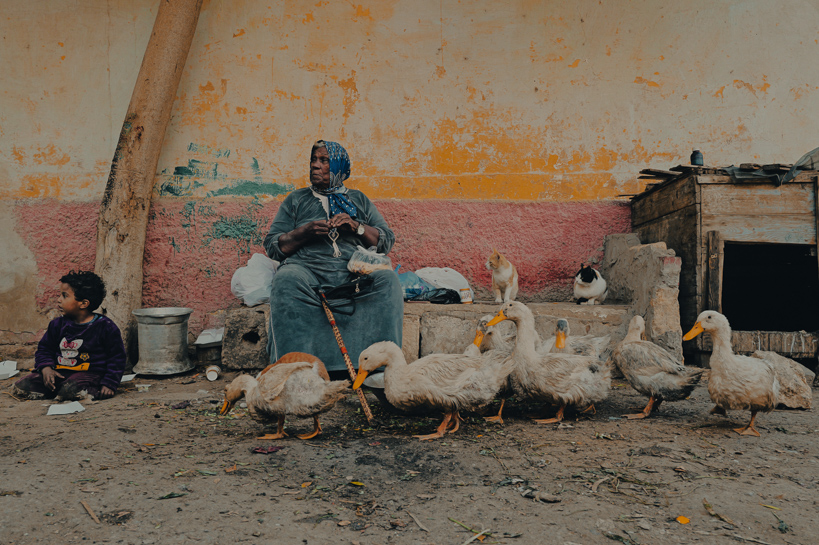 Al-Ghafeer, Le Caire, Égypte. Bilahil et sa grand-mère Nariman sont assis devant la maison familiale où ils vivent depuis 73 ans. Aujourd'hui, toute la famille y habite encore. Sa fille, Imen, âgée de 49 ans, y a toujours vécu et dit qu'elle « mourra ici ».