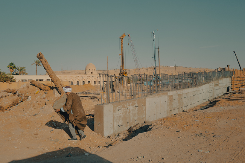 Al-Khalifa, Le Caire, Égypte. De nombreux travaux sont en cours le long de la route Salah Salem qui longe le cimetière Al-Khalifa. Inexorablement, les chantiers de béton modifient le paysage urbain et son caractère patrimonial.