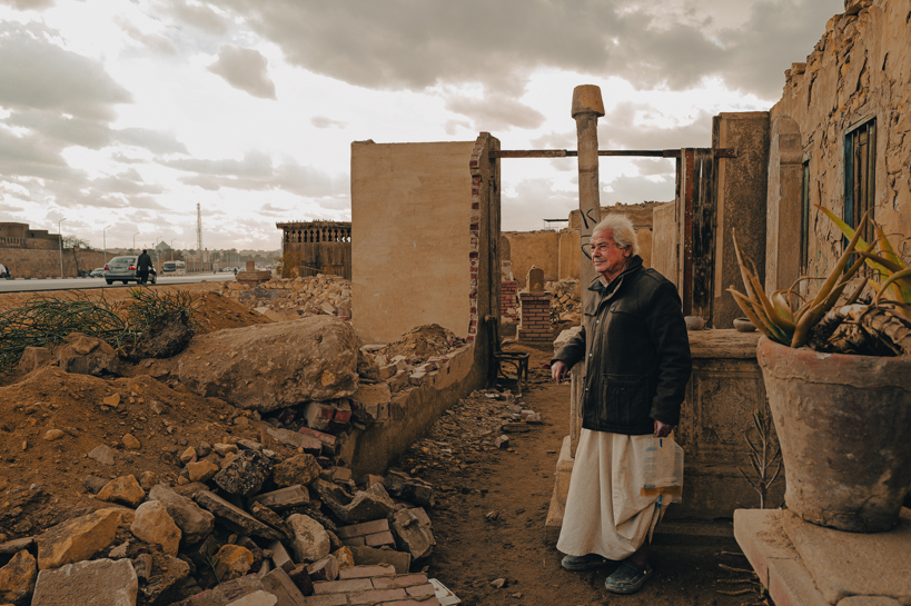 Al-Khalifa, Le Caire, Égypte. Hafez vit depuis trois ans dans les ruines de son ancienne maison, détruite avec une partie du cimetière en mai 2023. Le vieil homme dort sur un simple matelas, sous un abri de fortune qui le protège à peine de la pluie. Affaibli, il garde en permanence une poche d'urine à la main, faute d'accès à des soins ou à des sanitaires. À quelques mètres seulement de son lit passe désormais une grande route asphaltée.