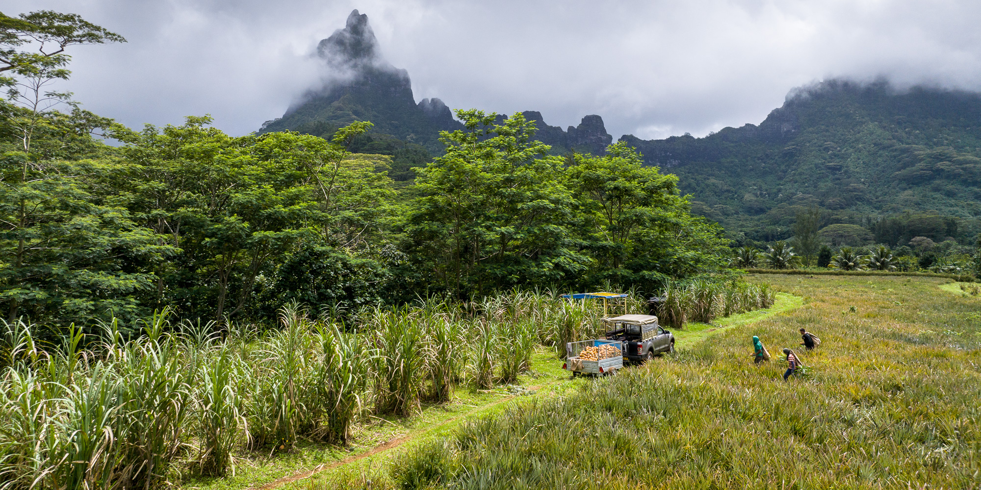 Sous les conseils avisés de son père, septuagénaire désormais à la retraite, Gaston Hanere Jr. applique les techniques de cassage traditionnelles lors de la récolte annuelle. « Il faut savoir gagner du temps sans abîmer le fruit », confie-t-il. Leurs aïeux cultivaient déjà l'ananas sur cette parcelle familiale, située au pied du mont Rotui (ici en arrière-plan). Aujourd'hui, l'exploitation met en valeur deux parcelles : un lot de 1,43 hectare relativement plat, et un autre de 0,71 hectare plus escarpé.
