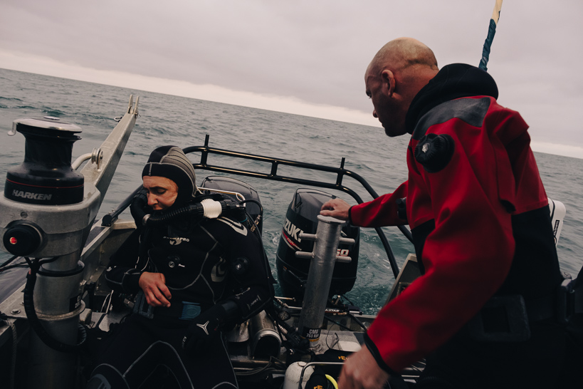 Céline Labrune et Benoit Gouillieux préparent une plongée. L'équipe plonge avec des recycleurs, un appareil en circuit fermé permettant une plus grande autonomie et aussi davantage de discrétion au fond de l'eau puisqu'aucune bulle n'est émise, le CO2 étant stocké dans de la chaux.