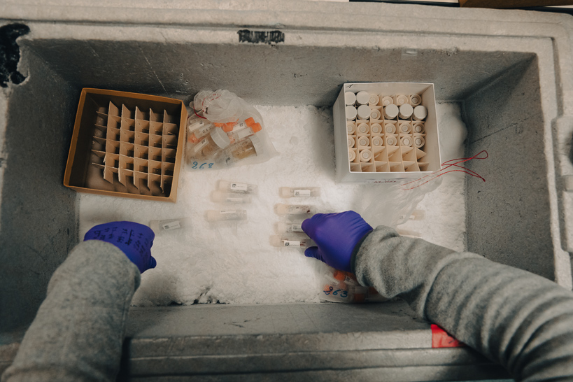 Les échantillons ont été regroupés dans des petits filets lors d'une mission DIVE-Sea. Ci-contre, Murielle Ronsin, technicienne supérieure de laboratoire, ouvre les filets un par un et place les tubes sur la carboglace pour préserver le froid. Elle communique les numéros des filets à sa consœur ainsi que les identifiants de chaque tube. Les code-barres sont scannés.