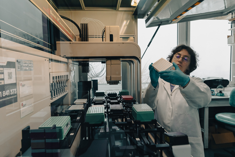 Claudine Louesse, technicienne supérieure de laboratoire, utilise des robots pipeteurs pour distribuer les réactifs utilisés pour la préparation des banques de séquençage. Elle vérifie que les réactifs ont été correctement distribués dans la plaque.