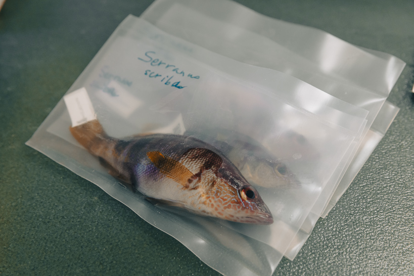 Après prélèvement de ses tissus, ce spécimen de Serranus scriba est conservé dans une gaine scellée et placé au congélateur.