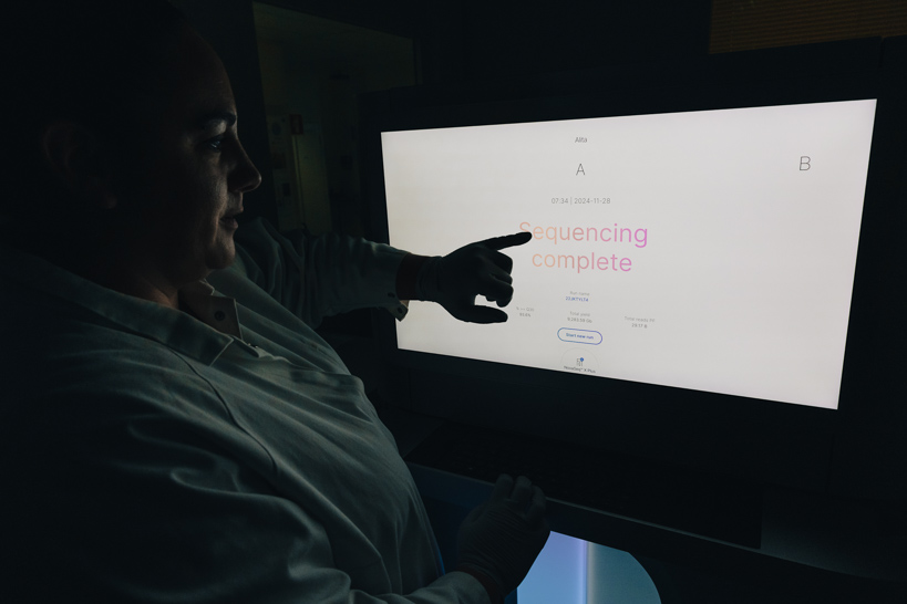 Julie Batisse, technicienne supérieure de laboratoire, vérifie la qualité du séquençage réalisé. Le séquenceur lit l'ADN pour déterminer l'ordre des bases qui le constituent. L'ADN est constitué de 4 molécules (nommées A, C, T et G) dont l'enchaînement, dans un ordre très précis, singularise chaque organisme.