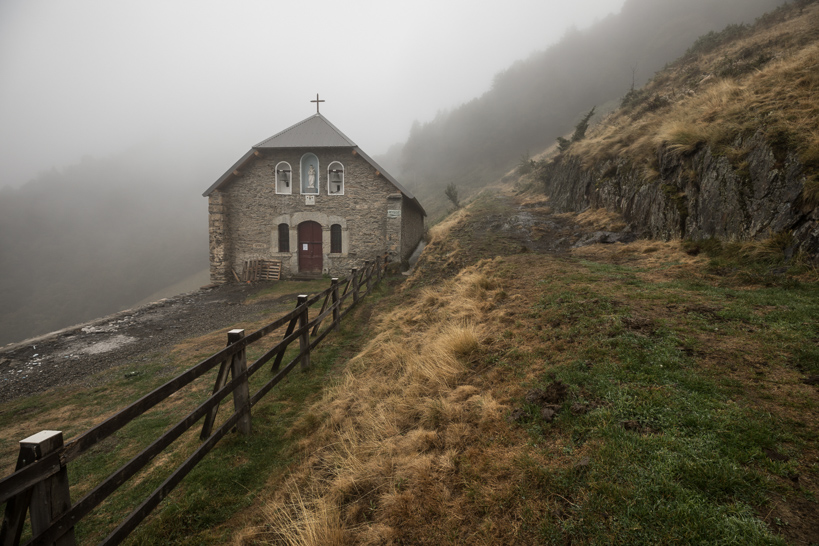 Après qu'une tempête en 2018 ait endommagé l'édifice, notamment sa charpente, les bénévoles de l'Association pour la sauvegarde de la chapelle de l'Izard se sont mobilisés pour sa restauration. Ici, avant la fin des travaux, un jour de brouillard.