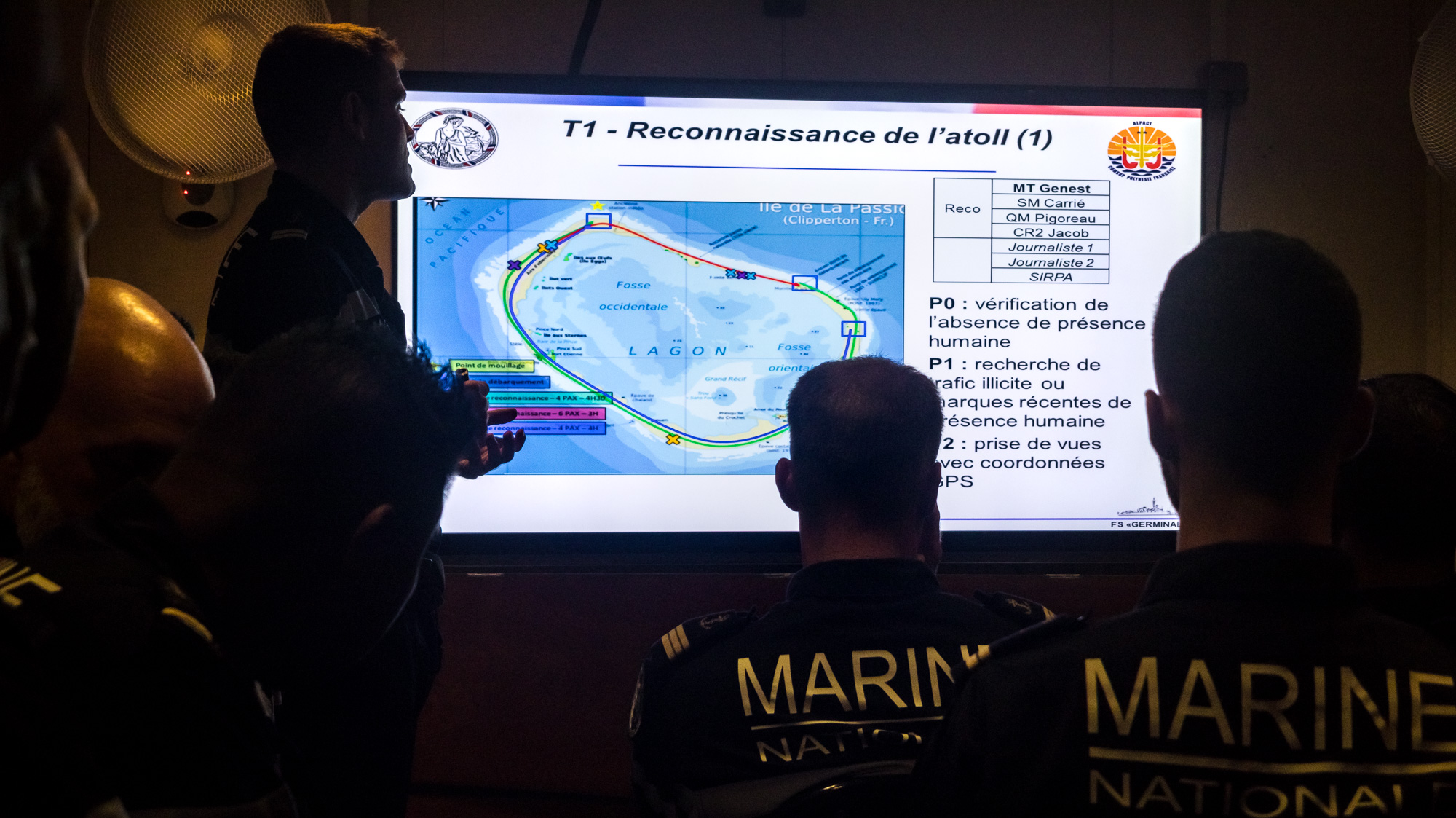 Dans le cadre de la mission « Passion 2023 », une soixantaine de militaires débarquent les 18 et 19 avril 2023 sur l'atoll. Parvenus à proximité de la côte, ils devaient se jeter à l'eau pour franchir les derniers mètres qui les séparaient de la plage, notamment pour protéger le moteur de leur embarcation. Ci-contre, le capitaine de frégate Chun-Jen Fang, commandant de la frégate de surveillance F735 Germinal, rejoint la plage en tenue de plongeur ; une évidence pour lui qui est plongeur-démineur de spécialité.