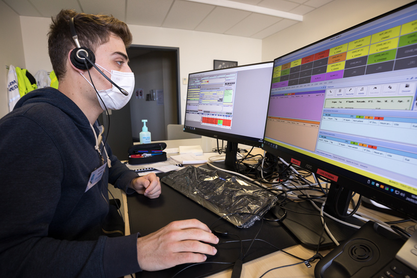 Afin de limiter les risques de contamination du personnel du SAMU, toute personne entrant dans le bâtiment doit impérativement s'équiper d'un masque et se soumettre à une prise de température. Ce sont des étudiants de professions médicales ou paramédicales qui s'occupent de ces missions, comme ici, une étudiante en pédicure-podologie.