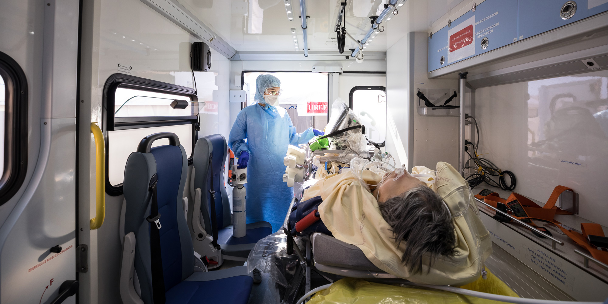 Après son scanner, un patient est réinstallé dans le box covid où il sera à nouveau totalement isolé par mesure de sécurité. Lors de son passage au scanner, le patient était sous l'assistance d'un respirateur de transport ; il faut donc à nouveau le raccorder à celui de sa chambre.