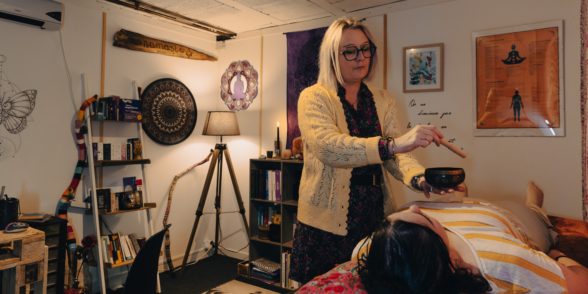 ![]() Enrichie de sa propre expérience, Laurence Groyer exerce la sonothérapie, mais refuse tout dogmatisme. Formée à différentes pratiques vibratoires, elle propose des séances comme des « voyages sonores » plutôt que des soins stricts, préférant créer un espace où « quelque chose peut se remettre en mouvement ». Elle joue divers instruments pour superposer des sons dont les effets varient sur les participants : apaisement, libération émotionnelle, sensations physiques, émergence d'images ou de souvenirs. Pragmatique, Laurence accueille ces manifestations sans interprétation et se positionne comme médiatrice plutôt que thérapeute. Elle refuse toute promesse de guérison au profit d'une expérience sensible, où l'écoute et l'intuition ouvrent une voie vers le bien-être. | ||||||