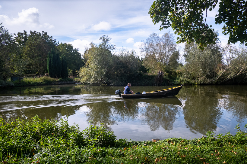 Nicolas navigue à bord d'une escute, barque traditionnelle à fond plat équipée d'un moteur. Il distribue le courrier et les colis à une cinquantaine de maisons et d'entreprises. La cadence augmente pendant les vacances scolaires, lorsque les maisons secondaires se remplissent. Ici toutefois, les « rues » n'ont pas de noms.