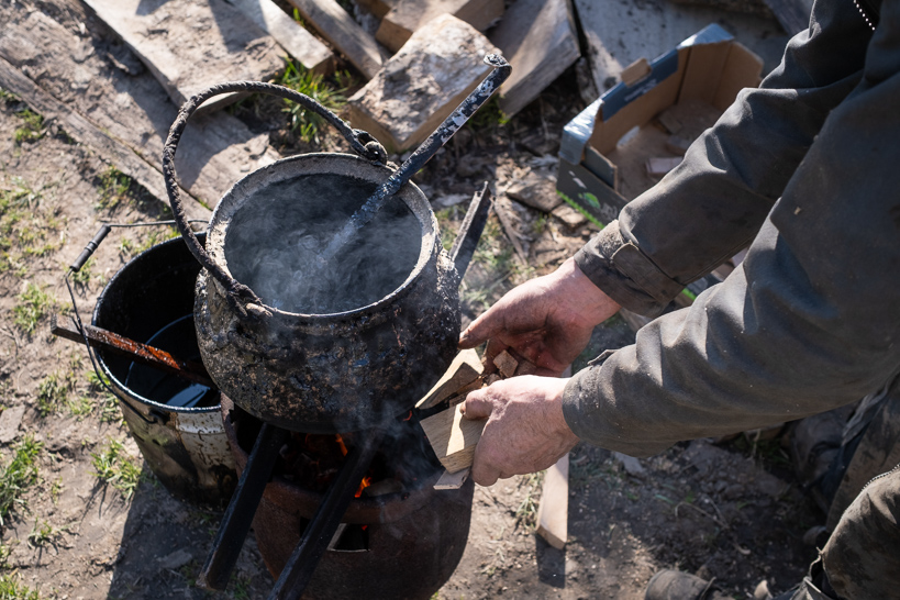 Le feu est entretenu sous une chaudière à goudron. Ici, on emploie du goudron conçu par distillation de résine végétale. Appliquée chaude, cette substance visqueuse et huileuse viendra sceller les fibres naturelles glissées entre les planches.