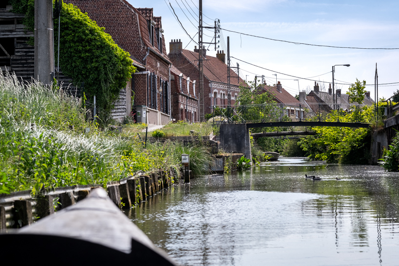 Les canaux viennent ici se faufiler jusqu'aux portes de la ville de Saint-Omer. C'est l'une des spécificités du Marais audomarois : un territoire où zones naturelles, habitations et activités coexistent depuis des siècles. Ici, la navigation mène au cœur de la nature autant qu'au pied des maisons en briques, caractéristiques des Flandres.