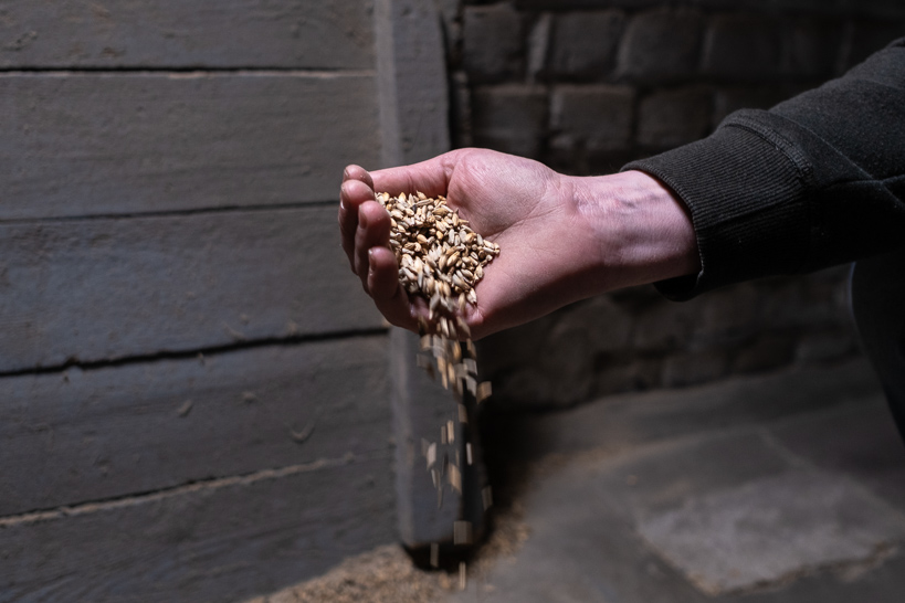 Lionel montre les céréales locales avec lesquelles il produit de l'alcool : orge, seigle et avoine. Broyées dans un concasseur, puis transformées en farine, elles seront brassées dans une cuve avant de fermenter pendant trois à quatre jours. On obtiendra alors une « cervoise », une bière sans houblon, qui sera distillée dans un alambic.