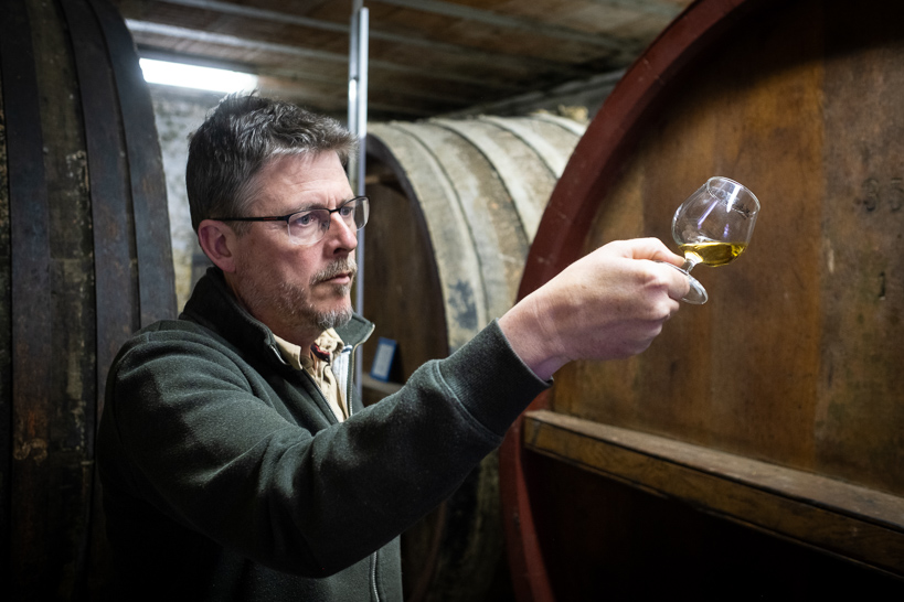 Dans l'obscurité fraîche du chai, Lionel procède à des dégustations régulières pour évaluer les qualités organoleptiques du genièvre. C'est lui qui décide si le spiritueux doit vieillir davantage ou être mis en bouteille.