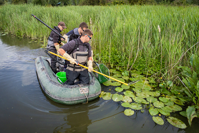 L'équipe de la Fédération de pêche du Pas-de-Calais réalise une pêche électrique afin de recenser les populations piscicoles. Benoît pilote l'embarcation, Raphaël porte le LR24 et sa perche émettrice (de couleur jaune), et Adrien tient l'épuisette. L'impulsion électrique permet d'étourdir les poissons sans les blesser.