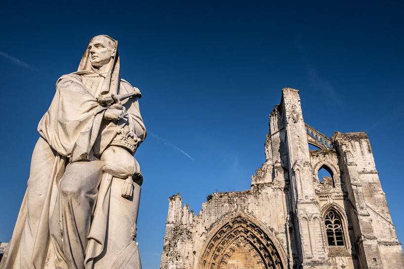 Devant les vestiges de l'abbaye Saint‑Bertin, fondée au VIIᵉ siècle, une statue rappelle l'engagement des moines dans l'aménagement du marais. Dès leur arrivée, les bénédictins ont entrepris le creusement des premiers canaux, transformant un vaste bassin d'eau saumâtre en terres cultivables.