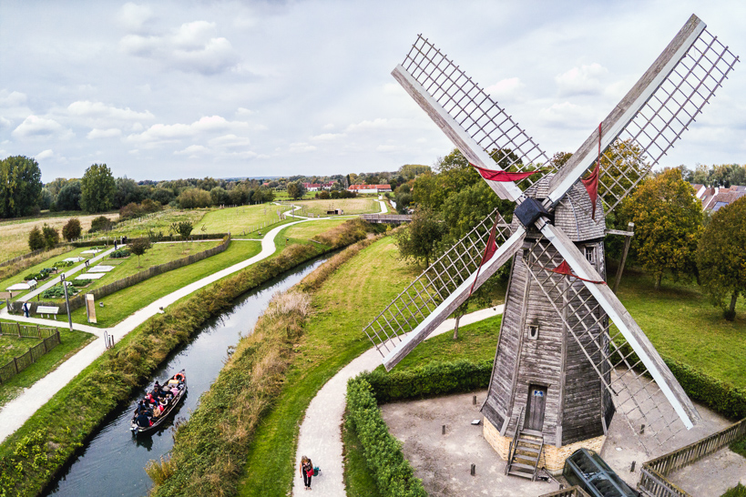 Un groupe de visiteurs découvre le moulin de l'Aile construit dans les années 2010. Cet ouvrage est la copie de celui qui fut érigé en 1866 non loin de là, en bordure de la Petite Clémingue. Endommagé par une bourrasque en 1948, l'original fut démonté en 1983. Équipé d'une vis d'Archimède, il permettait de drainer quelque 50 hectares.