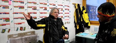 La nuit est encore installée lorsque les pisteurs se retrouvent au central. Arnaud Trinquier, directeur des pistes, distribue ses consignes pour que la station ouvre à l'heure.
