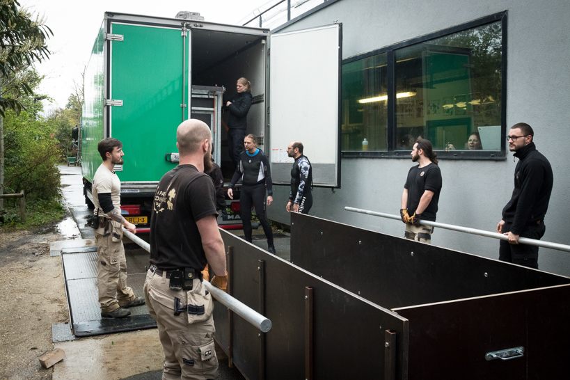 Nina, soigneuse, prépare de la volaille pour un fossa (Cryptoprocta ferox). « Nous devons porter des gants pour protéger les animaux », prévient-elle. Son confrère Mathieu ajoute : « Il faut même redoubler de vigilance pour les reptiles car les maladies sont dures à déceler. Chez les tortues, les symptômes d'une maladie mortelle se développent si lentement qu'on peut mettre 6 mois à s'en apercevoir, et après, la souffrance est d'autant plus longue avant la rémission. Pour les tortues par exemple, la salade fraîche doit être coupée le matin même, sinon les apports nutritifs seraient anéantis. »