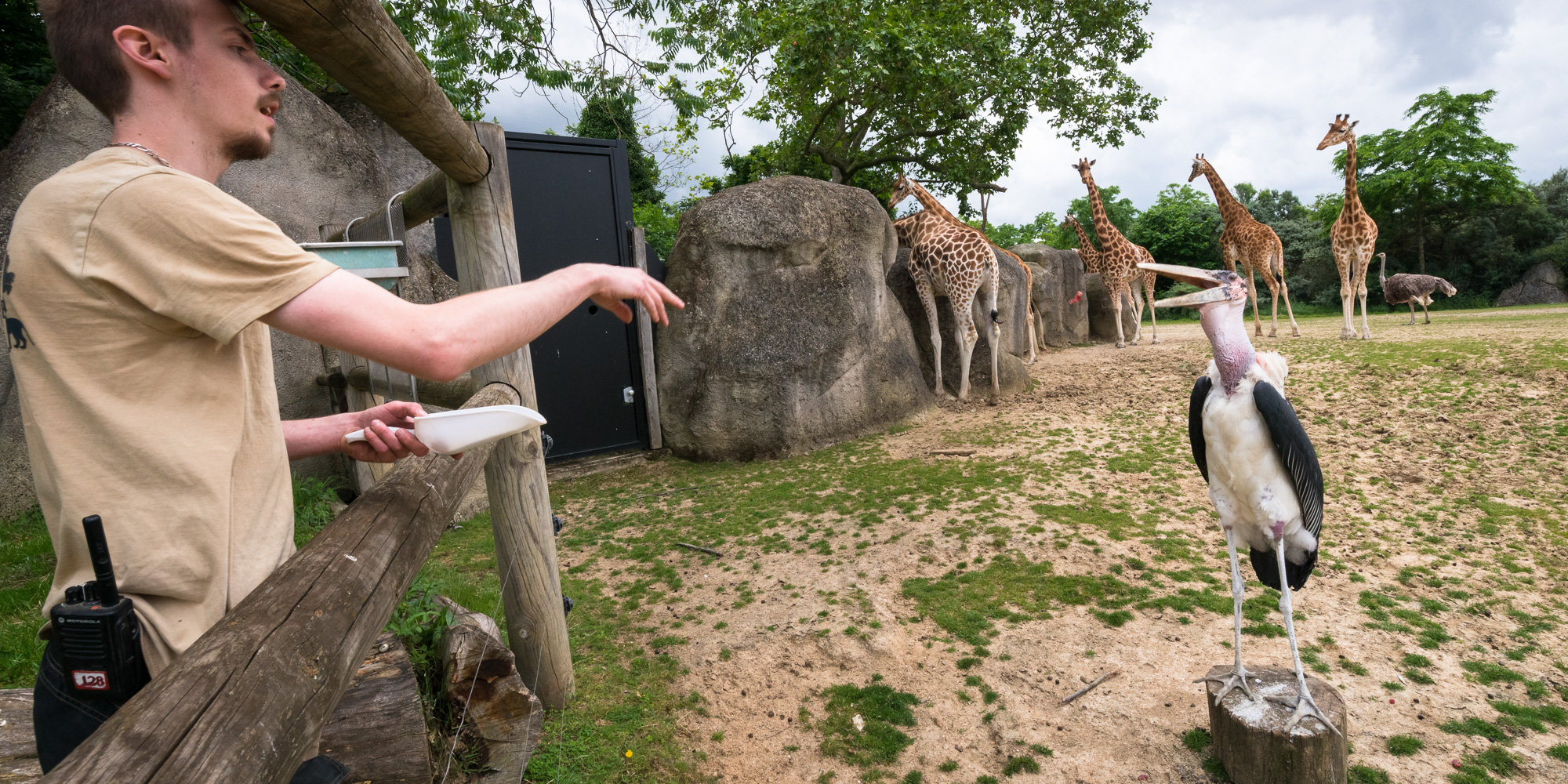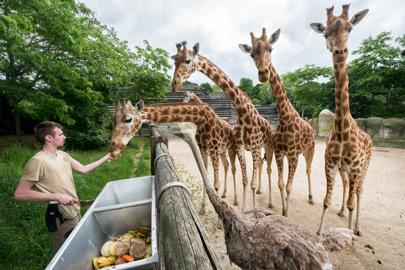 Antoine, soigneur, nourrit les girafes d'Afrique de l'Ouest (Giraffa camelopardalis) en prenant soin de contenter les plus craintives. Dans la nature, une girafe mange quotidiennement entre 7 et 70 kg de feuilles, mais celles qui vivent à Paris ont un régime plus diversifié. Chaque jour, une girafe va donc consommer 600 g de bananes, 750 g de pommes, 1,250 kg d'oignons, 1,250 kg de carottes, et, 5 à 7 kg de barbotine (mixture d'avoine et d'orge bouillie), et jusqu'à 18 kg de luzerne (disponible à volonté). Des minéraux, vitamines et oligo-éléments leurs sont également prodigués.
