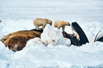 Une trentaine d'ours polaires se partagent la carcasse d'une baleine qui gît au milieu de la banquise, près de l'embouchure du Scoresby Sund. Mis en image pour la première fois, ce comportement est inhabituel au regard des données éthologiques actuelles. Solitaire, le prédateur se retrouve cette fois à proximité de ses congénères, sans manifestement éprouver le besoin de se battre ni d'écarter les concurrents. Dans ce milieu extrême, une telle opportunité permet à chaque individu (mâle, femelle et ourson) d'entamer l'été avec le ventre plein.