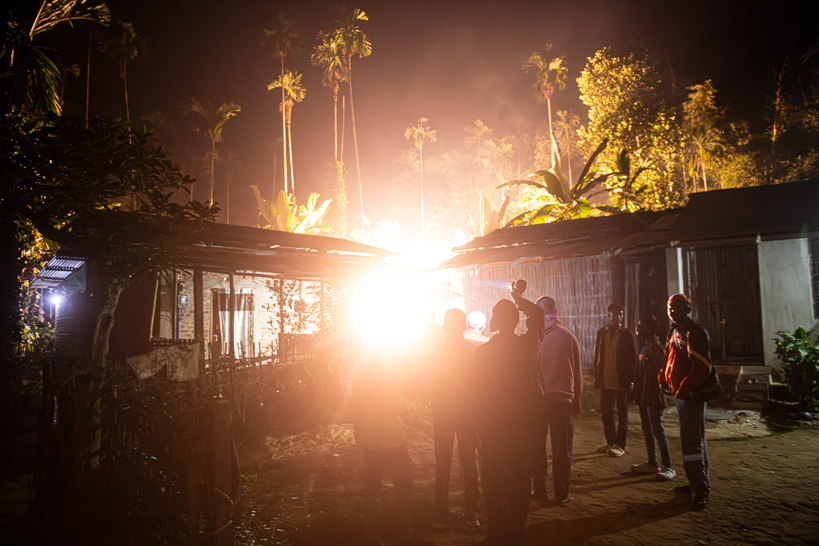 Rangbong, Assam, Inde. Une puissante explosion déchire la pénombre pour effaroucher un troupeau d'éléphants. Au premier plan, des villageois se sont rassemblés pour repousser un éléphant qui tentait de s'introduire dans une cuisine.