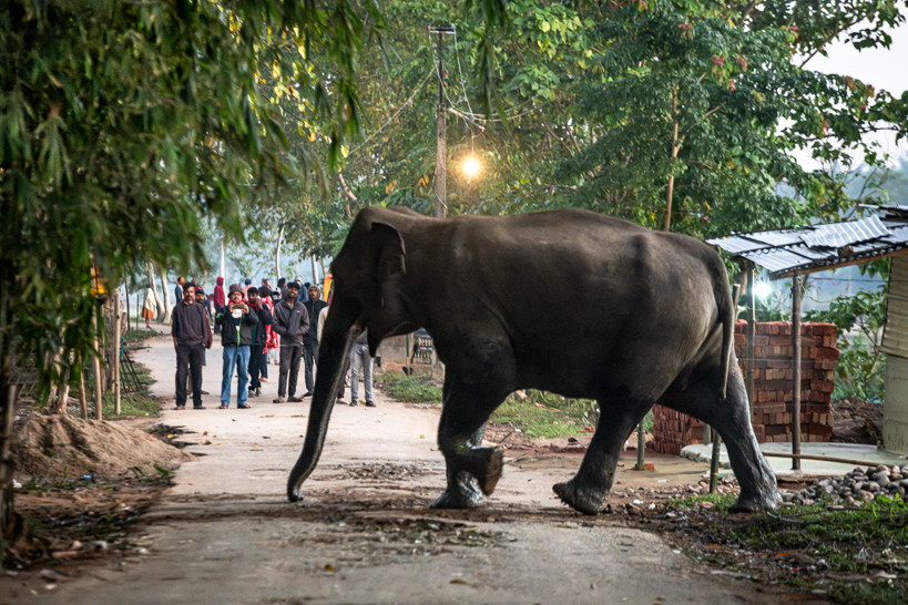 Jathipotia, Assam, Inde. Un éléphant traverse un village à l'aube. Les habitants, habitués au passage de troupeaux, filment la scène pour alimenter les réseaux sociaux. Une discipline prisée des créateurs de contenus qui monétisent leurs vidéos.