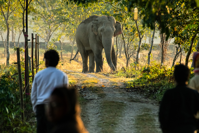 Jathipotia, Assam, Inde. Au petit matin, un éléphant sauvage longe les fils électriques pour se diriger vers un village. Démunis, les habitants restent vigilants face à cette matriarche déterminée à passer. « Les attaques arrivent par hasard au détour d'un chemin, quand l'animal apeuré se sent menacé », confie Vikesh qui a perdu sa mère en 2004, tuée par un éléphant.