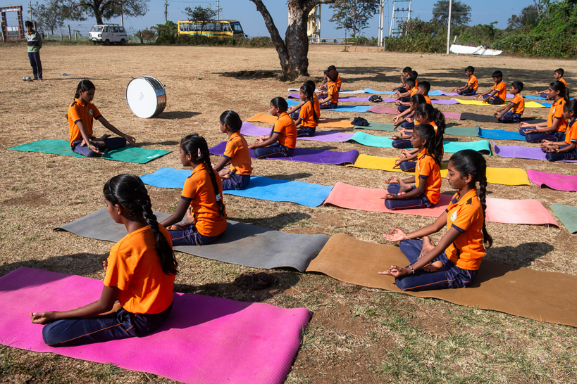 Hegganur, Karnataka, Inde. Des écoliers participent à leur séance de yoga quotidienne. Pays le plus peuplé au monde, avec plus d'1,4 milliard d'habitants, l'Inde cumule une fécondité longtemps élevée, une transition démographique plus tardive qu'en Chine, et une progression de l'espérance de vie. Près d'un Indien sur deux a moins de 30 ans, ce qui en fait l'un des pays les plus jeunes. Cette dynamique favorise l'anthropisation des derniers milieux naturels, et exerce une pression dommageable sur la faune sauvage.