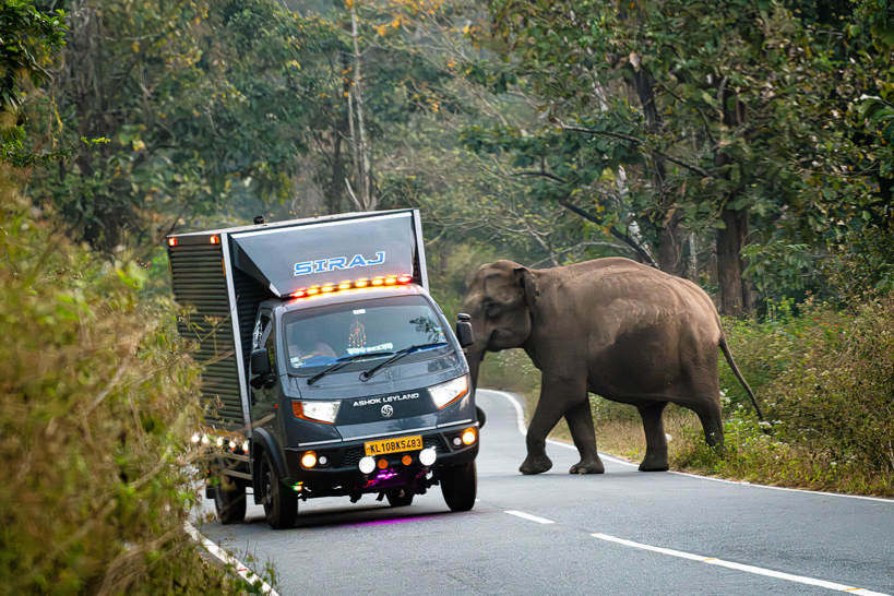 Tholpetty, Kerala, Inde. Une camionnette fait un écart pour éviter un éléphant qui traverse la route reliant Tholpetty à Kutta. Les automobilistes ont appris à se méfier, mais les collisions avec les voitures ou les trains restent fréquentes, ou souvent fatales.
