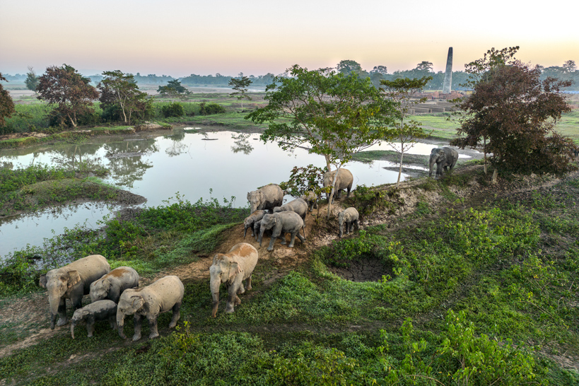 Jathipotia, Assam, Inde. Après avoir traversé un village à l'aube (dont ici une briqueterie), un troupeau d'éléphants conduit par une femelle dominante se dirige vers une rivière pour se baigner. À l'arrivée de la saison sèche, les éléphants empruntent des routes ancestrales pour trouver de l'eau et de la nourriture. Avec l'anthropisation, de nombreux obstacles entravent aujourd'hui leurs déplacements et augmentent les situations conflictuelles avec les humains.