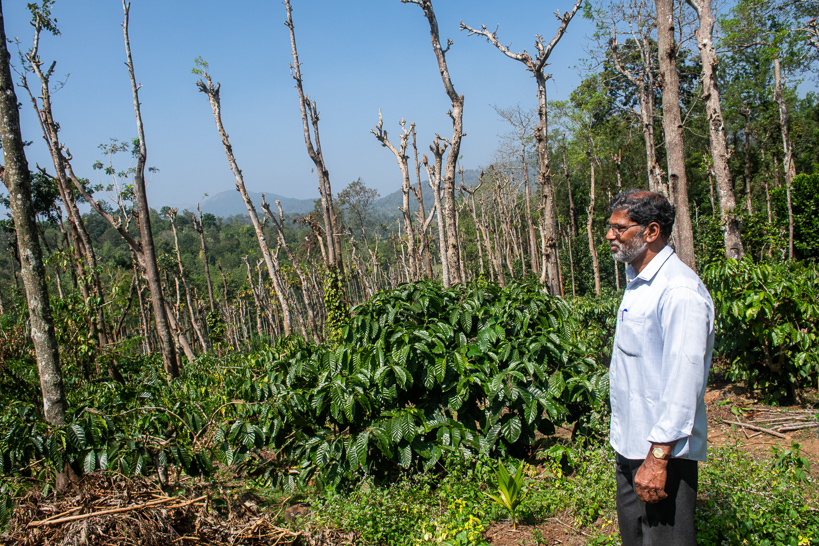 Kattikullan, Kerala, Inde. Un contremaître inspecte de jeunes plants de café. En Inde, cette culture s'est développée à partir du XIX siècle dans les collines du sud (Karnataka, Kerala, Tamil Nadu) entraînant un déboisement important. Ici, des troncs d'arbre ont été conservés comme autant de supports à la culture de poivriers (espèce grimpante). Au Kerala, ces exploitations sont le plus souvent gardées et entourées de clôtures pour empêcher les éléphants de s'introduire.