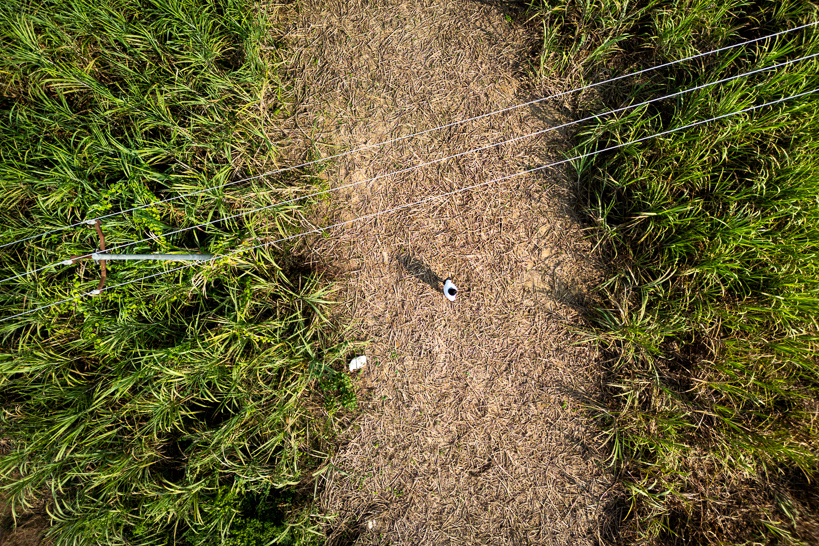 Keroni, Assam, Inde. Dhananjay, instituteur, constate les dégâts causés par le passage d'éléphants dans une plantation de cannes à sucre adjacente au village. Les herbivores ont avancé en colonne pour se nourrir, ne laissant rien derrière eux.