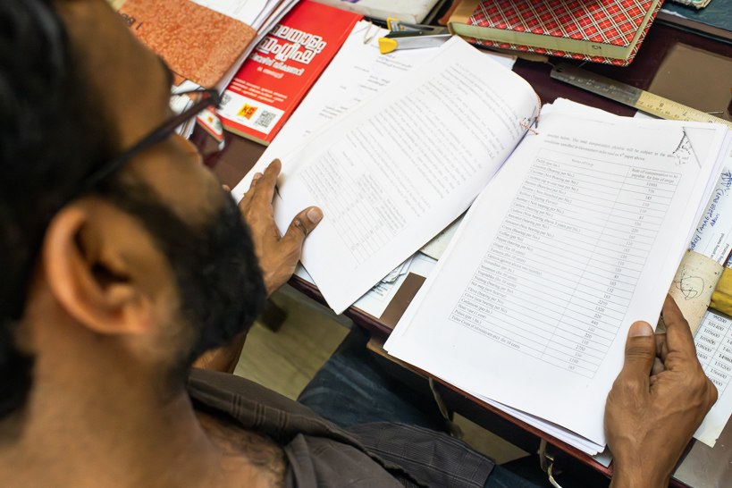 Begur, Kerala, Inde. Un agent administratif du Bureau des forêts consulte un registre répertoriant l'ensemble des cas de figure liés aux conflits avec les éléphants. Le document distingue les dommages matériels – cultures, bétail, habitations – des préjudices immatériels, notamment les atteintes corporelles. Pour chaque sinistre, une somme d'argent est accordée en dédommagement. Les procédures sont initiées en ligne, puis des agents seront dépêchés sur le terrain pour constater et valider la demande.