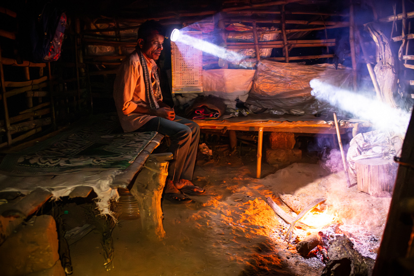 Kattikkulam, Kerala, Inde. Un veilleur de nuit se réchauffe pendant sa garde nocturne. Il est missionné par les villageois pour surveiller les incursions d'éléphants sauvages et protéger les cultures.