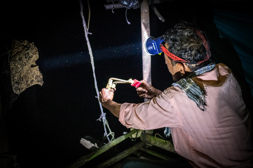 Kattikkulam, Kerala, Inde. Depuis une tour de guet, un veilleur de nuit utilise une fronde pour jeter des pierres aux éléphants présentant une menace.