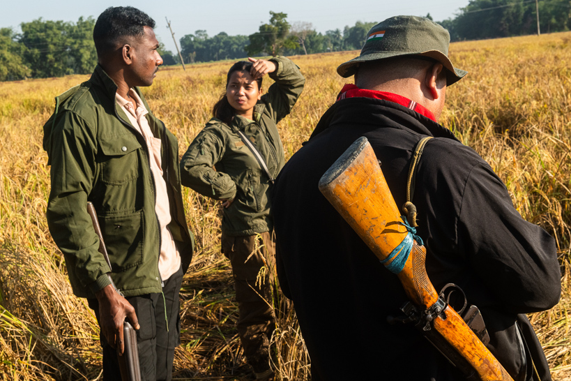 Jathipotia, Assam, Inde. Trois rangers observent un troupeau d'éléphants qui piétinent un champ de riz. Armés de fusils (carabine, fusil à pompe), ils procèdent le plus souvent à des tirs d'effarouchement, mais ils n'hésitent pas à tirer de la grenaille sur les animaux les plus farouches.