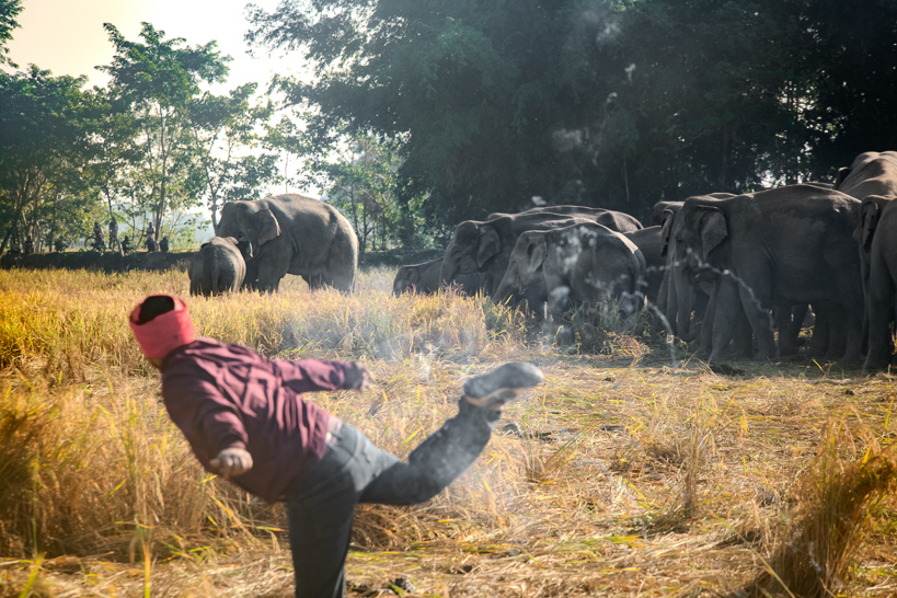 Jathipotia, Assam, Inde. Un villageois lance des pétards sur un troupeau d'éléphants qui piétinent un champ de riz.