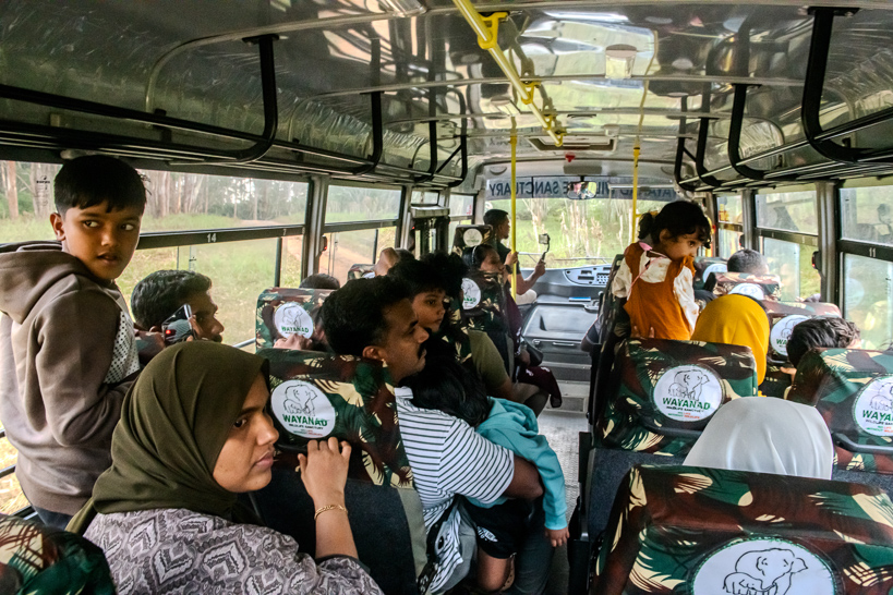 Nagarhole, Karnataka, Inde. Des tours en bus sont proposés aux touristes pour visiter la Nagarhole Tiger Reserve. Bien moins chère que la location d'une jeep et de son chauffeur, cette solution reste bruyante et peu confortable pour explorer les routes pittoresques du parc et espérer voir des espèces emblématiques comme l'éléphant d'Asie ou le tigre du Bengale.