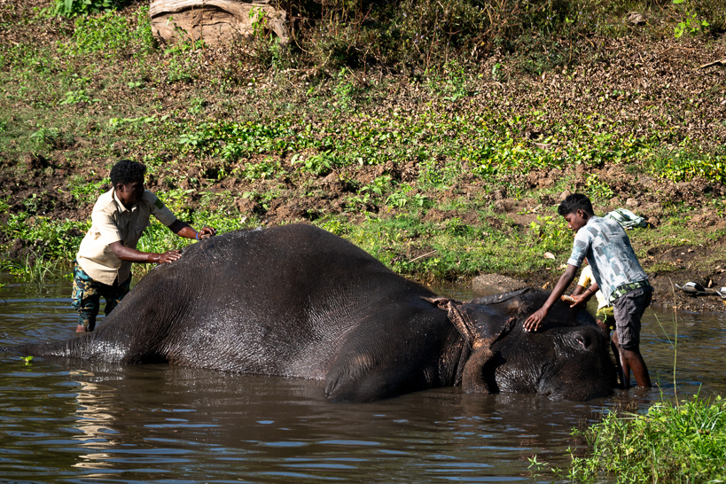 Balle, Karnataka, Inde. Munis de brosses dures, un homme et deux enfants nettoient le corps d'un éléphant couché dans la rivière. Cette opération permet d'enlever la boue séchée, les parasites et les algues qui recouvrent la peau épaisse mais sensible de l'animal. C'est aussi un moyen de le rafraîchir, et un moment clé dans la confiance établie. Le métier de cornac, ses connaissances et ses techniques, se transmettent souvent de parent à enfant.