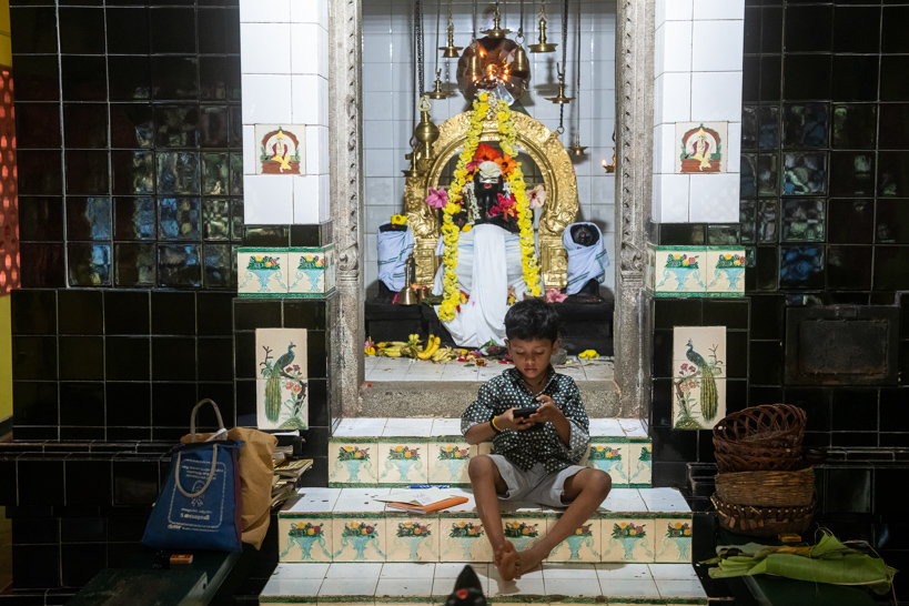 Nagarhole, Kerala, Inde. Un garçon tourne le dos à une statue de Ganesh pour jouer avec le téléphone de ses parents. Le dieu Ganesh est vénéré comme celui qui lève les obstacles et annonce le succès. Il est représenté avec un visage d'éléphant.